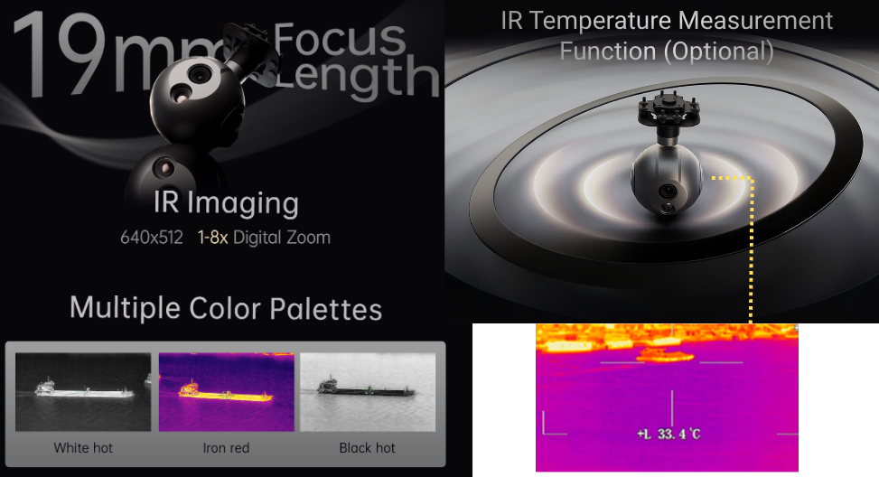 • Опциональная функция инфракрасного измерения температуры позволяет фиксировать тепловые показатели в диапазонах от –20 °C до +150 °C, от 0 °C до +550 °C либо в пользовательском режиме, отображая на экране минимальные, максимальные и промежуточные значения. Тепловизионный модуль A20KT-19 оснащён неохлаждаемым VOx-сенсором формата 640×512 с размером пикселя 12 µm и объективом 19 мм с защитным DLC-покрытием, работающим в длинноволновом диапазоне 8–14 µm. Высокая чувствительность детектора (NETD ≤ 50 mK) обеспечивает уверенное обнаружение тепловых целей — людей, автомобилей, источников тепла — даже при слабом контрасте, в полной темноте, дыму или неблагоприятных условиях видимости.