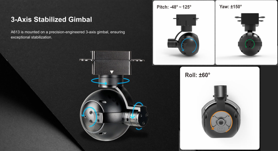 Камера A613 оборудована высокостабильным 3-осевым моторизованным карданным подвесом, обеспечивающим плавную и стабильную съёмку даже при динамических манёврах платформы или вибрациях. Механический диапазон движения подвеса включает тангаж/наклон от −48° до +125°, крен ±60° и рыскание/панорамирование ±150°, при этом управляемый диапазон составляет тангаж −45…+120° и рыскание ±145°, что позволяет гибко охватывать нужные участки обзора. Уровень вибрации по всем осям минимален — ±0,02°, что обеспечивает чёткий видеопоток без дрожания и потери деталей. Подвес поддерживает функцию «One-key to center», позволяющую быстро возвращать камеру в центральное положение для удобства управления и калибровки. Компактные размеры, малый вес 238 г и возможность работы в широком диапазоне температур делают камеру универсальной для задач видеонаблюдения, мониторинга, аналитики и поисково-спасательных операций.