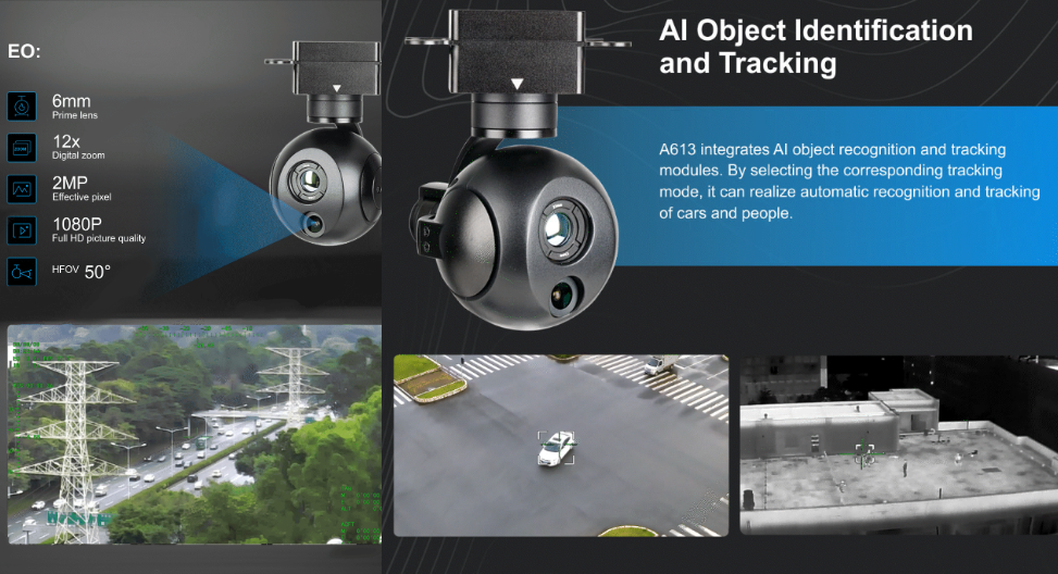 Благодаря сочетанию EO- и IR-визуализации, высокостабильного 3-осевого подвеса, AI-отслеживания и компактного лёгкого корпуса с гибкими интерфейсами управления, камера A613 идеально подходит для охраны и патрулирования объектов, мониторинга периметров и транспортных потоков, поисково-спасательных операций, инспекции инфраструктуры и промышленных объектов, а также для интеграции в мобильные системы на базе дронов, наземных платформ или роботов.