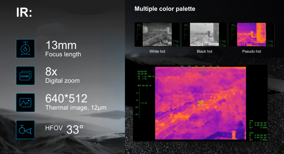Разрешение ИК-тепловизора 640×512, размер пикселя 12 мкм, объектив 13 мм, VOx детектор с диапазоном длин волн 8–14 мкм