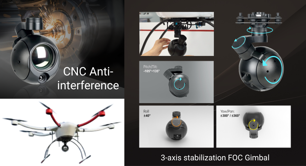5-кратный тепловизионный оптический зум, 3-осевая стабилизация FOC