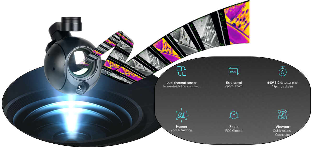 Благодаря сочетанию двух тепловых сенсоров с разными полями обзора (FOV), гибким режимам трекинга, интеллектуальному распознаванию целей с помощью AI, широким интерфейсам управления и возможности вывода видео через HDMI и сетевой IP, AT9-50 является идеальным инструментом для комплексного мониторинга территорий и периметров, охранных задач, инспекции инфраструктуры и транспорта, а также для поиска и спасения в сложных условиях. Камера обеспечивает автоматическое сопровождение движущихся объектов и удобную интеграцию на UAV и мобильные платформы, предлагая высокоточную тепловизионную визуализацию и интеллектуальное слежение. Её высокая надёжность, долговечность и простота эксплуатации делают AT9-50 незаменимым инструментом для профессионалов, которым требуется точное и стабильное тепловое изображение в критически важных операциях. Устройство эффективно применяется для обеспечения общественной безопасности, мониторинга потенциальных угроз на границах и в городских зонах, инспекции объектов, таких как солнечные панели, электростанции и трубопроводы, а также для повышения эффективности поисково-спасательных операций через быстрое обнаружение и отслеживание людей и транспортных средств.
