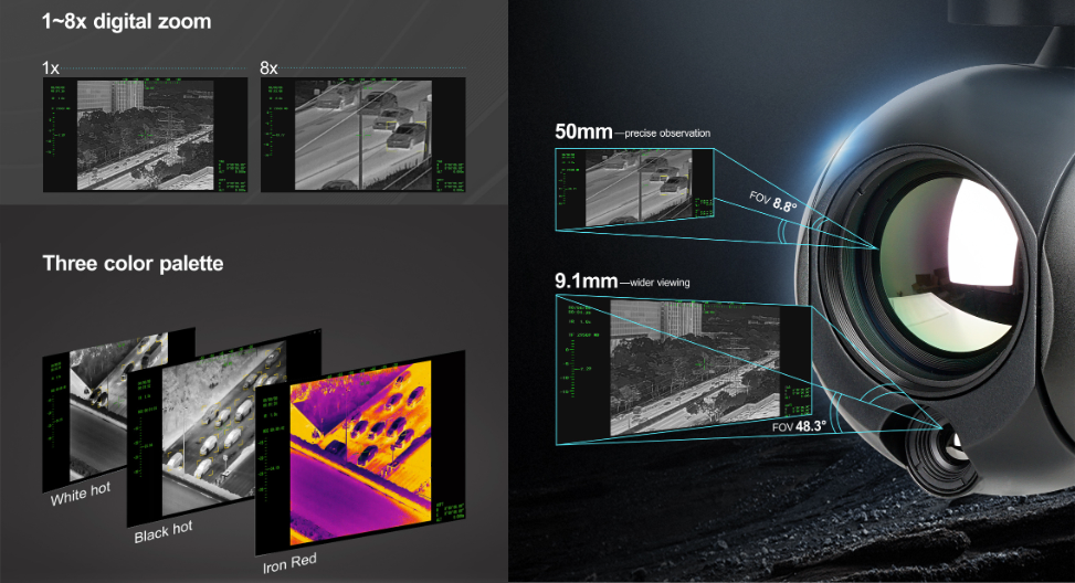 • Оба модуля поддерживают цифровой зум 1×–8×, стандартные тепловые палитры (white hot, black hot, pseudo color) и работают в пассивном режиме, обеспечивая надёжную визуализацию объектов независимо от условий. Переключение между объективами формирует эквивалентное «термическое оптическое масштабирование» ≈5×, сочетая широкий обзор сцены с глубокой детализацией цели, что делает AT9-50 эффективным инструментом для охраны периметров, патрулирования и дальнего мониторинга.
