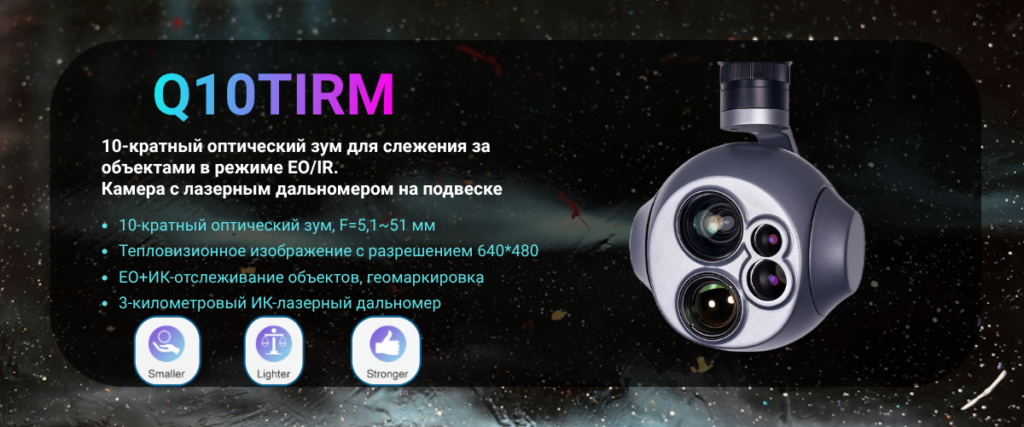 Q10TIRM — это компактная мультисенсорная gimbal-камера, объединяющая оптический канал с 10× зумом, тепловизор 640×480 и лазерный дальномер до 3 км в одном модуле. Она обеспечивает стабильное наблюдение днём и ночью, позволяя не только видеть цель, но и точно измерять расстояние и определять её координаты в реальном времени. Благодаря трёхосевой стабилизации и интеллектуальному трекингу камера сохраняет чёткое изображение даже при движении, а сочетание визуального и теплового каналов делает её универсальным решением для задач мониторинга, охраны и поисково-спасательных операций.