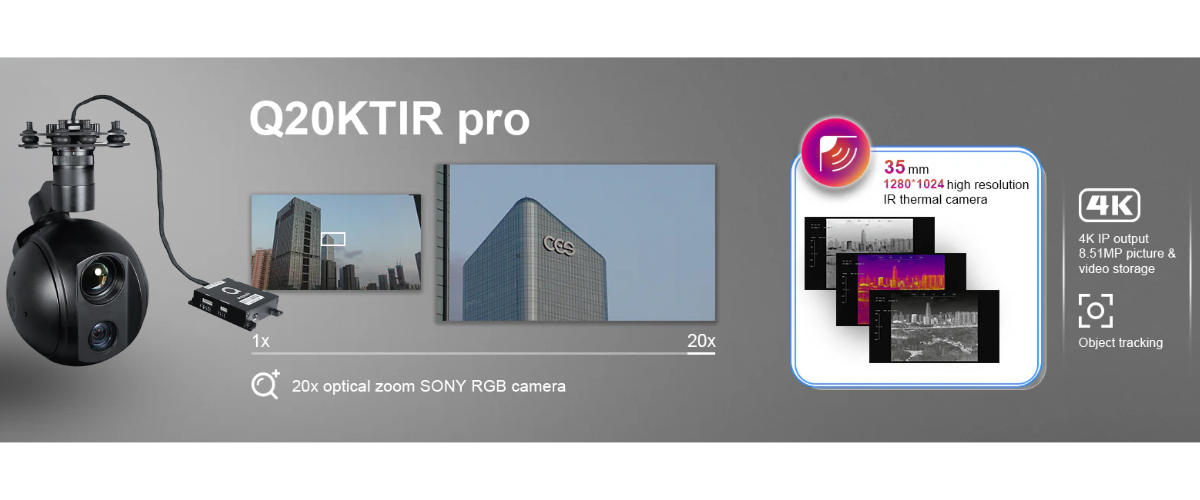 Камера Q20KTIR Pro сочетает EO + IR модули, 20× оптический зум, высокоточную стабилизацию, интеллектуальный трекинг, гибкое управление и многоформатный вывод видео, что делает её универсальным инструментом для самых разных задач. Она эффективно используется для охраны периметров, мониторинга территорий, инспекций инфраструктуры, патрулирования, наблюдения за транспортом, ночного и теплового наблюдения, поисково-спасательных операций, а также при мониторинге труднодоступных объектов и в условиях низкой видимости. Камера позволяет записывать и документировать объекты, фиксируя их на фото и видео для последующего анализа. Благодаря универсальности, надежности и широкому функционалу, Q20KTIR Pro подходит как для гражданских задач — инспекции, мониторинг, охрана, экологический контроль, так и для профессиональных и оперативных целей — безопасность, спасательные службы, контроль инфраструктуры и охрана объектов.