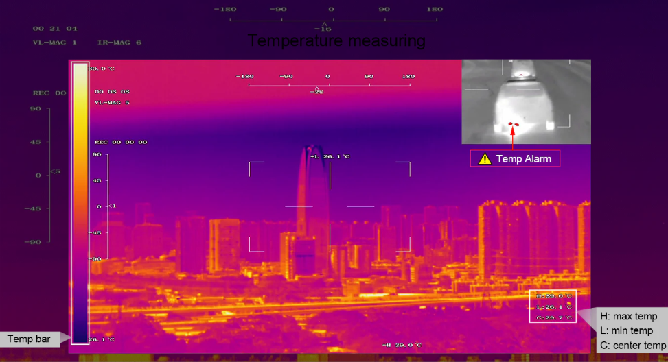 • Камера поддерживает режим PIP, выводя одновременно тепловое и видимое изображение, что удобно при комбинированном мониторинге, поисково-спасательных задачах, инспекциях и охране объектов. Цифровой зум и высокая детализация обеспечивают эффективность наблюдения на больших дистанциях.