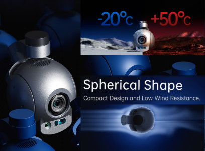 • Сферическая форма корпуса снижает сопротивление воздуху, позволяя стабильно работать при крейсерской скорости до 180 км/ч, что ускоряет патрулирование и повышает оперативное реагирование. Конструкция из алюминиевого сплава с ЧПУ оптимизирует теплоотвод и экранирование, увеличивает долговечность и обеспечивает высококачественную металлическую текстуру. Камера поддерживает быструю сборку и разборку по принципу Plug-and-Play, что упрощает подготовку к работе.