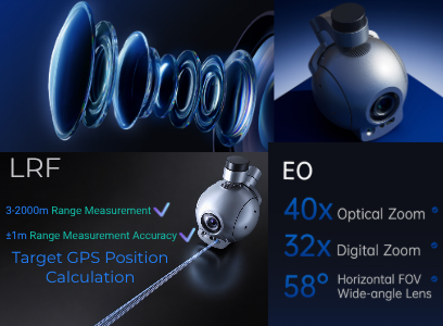 • Одной из ключевых особенностей является встроенный лазерный дальномер (LRF) с диапазоном измерения 3–2000 метров и точностью ±1 м, который при подключении внешнего GPS и подачи данных о времени позволяет вычислять географические координаты цели. Эти координаты могут отображаться на экране (OSD) и встраиваться в метаданные фото и видео, что делает систему эффективной для картографирования, инспекции территорий, охраны периметра, разведки и целеуказания.