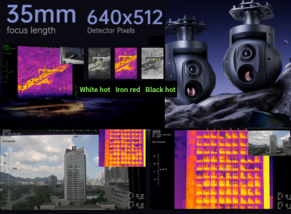 • UA40T‑35 поддерживает режим PIP (картинка в картинке) для EO и IR, позволяя одновременно выводить визуальное и тепловое изображение с двойными углами обзора для быстрого анализа сцены. IR-модуль представляет собой неохлаждаемый длинноволновый (LWIR) тепловизор с детектором 640×512 пикселей, объективом 35 мм и пиксельным шагом 12 µm, который фиксирует тепловое излучение объектов, людей и транспортных средств. Это обеспечивает эффективное наблюдение ночью, при дыму, тумане или плохой видимости, дополняя EO-камеру и позволяя вести комбинированный мониторинг визуального и теплового спектра.
